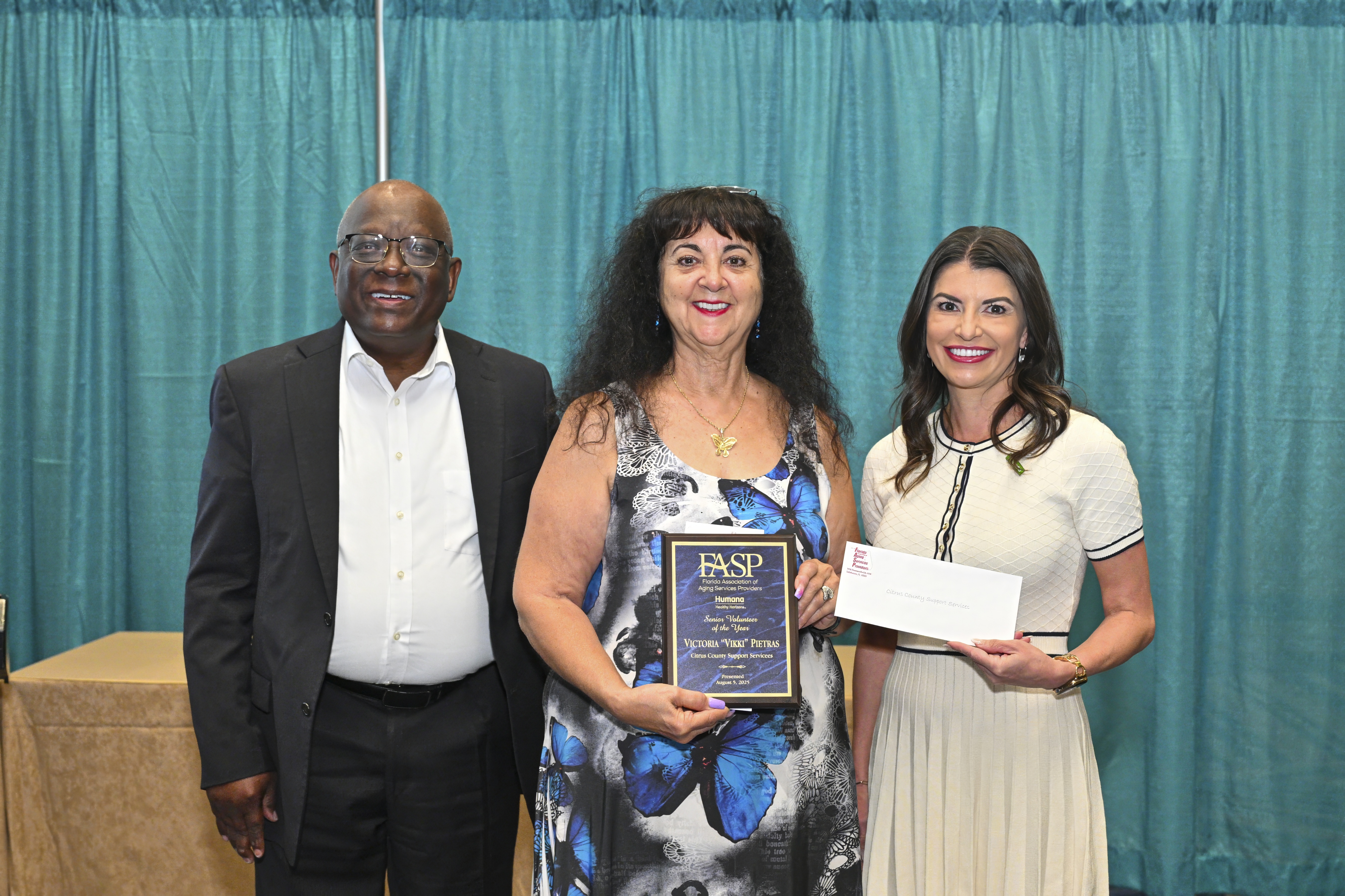 2025 FASP AwardsHumana Healthy Horizons Best DIRECT SERVICEEMPLOYEE OF THE YEAR AwarDCongratulations to Shari Gore of Hillsboroughb County Aging Services on her recent selection as the Humana Healthy Horizons Best Direct Service Employee of the Year. The award was announced at the Florida Conference on Aging, August 2025. The award included $500.00 for Ms. Gore and $500.00 for her Agency. (Left to Right: Darrell Drummond, FASP President, Shari Gore, Natalia Aresu, Humana Healthy Horizons in Florida) ![]() Humana Healthy Horizons Senior Volunteerof the Year AwardCongratulations to Victoria "Vikki" Pietras of Citrus County Support Services on her recent selection as the Humana Healthy Horizons Senior Volunteer of the Year. The award was announced at the Florida Conference on Aging, August, 2025. The award included $500.00 for Ms. Pietras and $500.00 for her Agency. (Left to Right: Darrell Drummond, FASP President, Vikki Pietras, Natalia Aresu, Humana Healthy Horizons in Florida)![]() These distinctions are bestowed to those who have: •Added value to the service benefiting and being delivered to elders •Gone above and beyond to provide customer service and ensure customer satisfaction •Developed community resources and support for provided services •Demonstrated a high level of commitment to excellence Employee of the Year Award Winners 2024 Terence Steward 2023 Tammy Lampi 2022 Shane Swords 2022 Brian Taylor 2021 Frances Duran-Brea 2020 Belkys Poueriet 2019 Lizabeth Miguel 2018 Carole Ware 2017 Ed Gines 2016 Paula Jory 2015 Sherry Tucker 2014 Toula Wootan 2013 Paulette Kozlowski 2012 Lori Radice 2011 Debbie Slade 2010 Therese Pokryfke Past Senior Volunteer of the Year Award Winners 2022 Diana Day 2021 Seth Thomas Miller 2020 Denise Hegener Past Scholarship Award Winners 2022 Diane Rhonelli 2022 Irene Soto